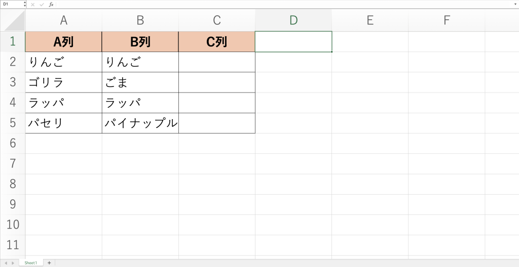 例えば、こちらのようなExcelデータがあるとして、A列とB列で重複しているセルをC列へ記載したいとします。