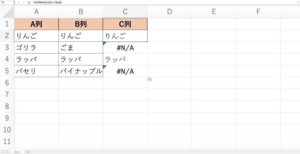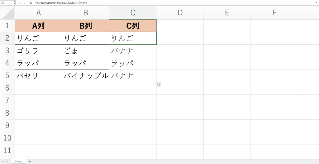 =IFERROR(VLOOKUP(A2,B:B,1,FALSE),"バナナ")