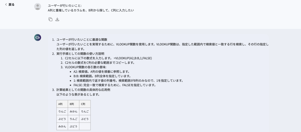 重複のない箇所は任意の入力をする関数を提案してくれたので、画像のように該当のセルは「バナナ」に置き換わりました。