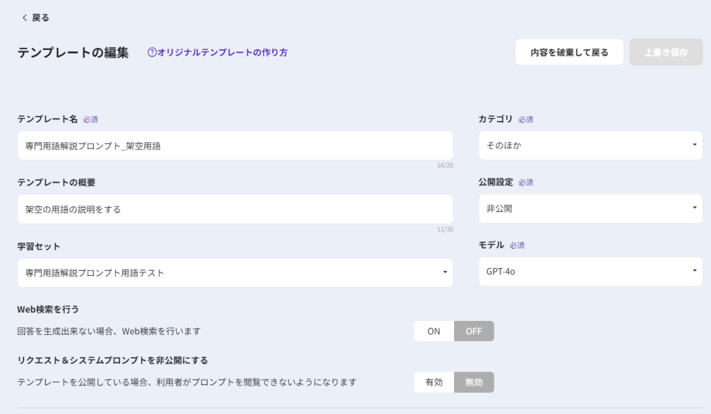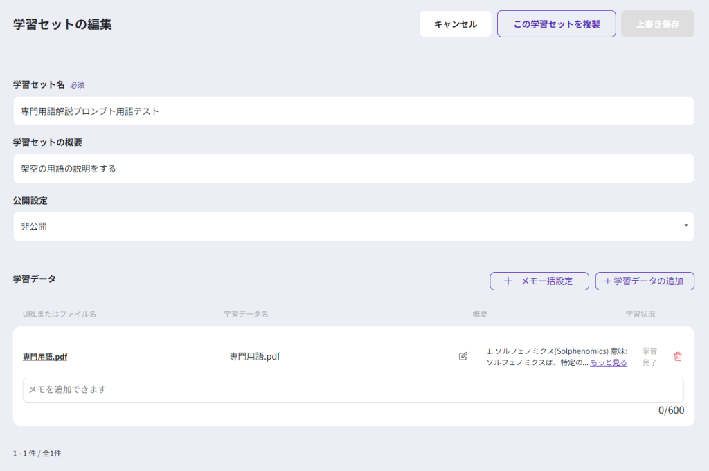 次に、エクスポートして学習セットとして「専門用語解説プロンプト」テンプレートに読み込ませます。