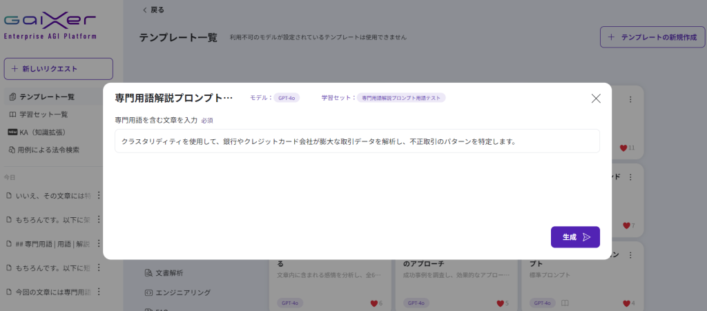 最後はGaiXerの学習セット機能と併用して、「専門用語解説プロンプト」テンプレートを試してみましょう。まずは、GaiXerに架空の専門用語集を作成させます。