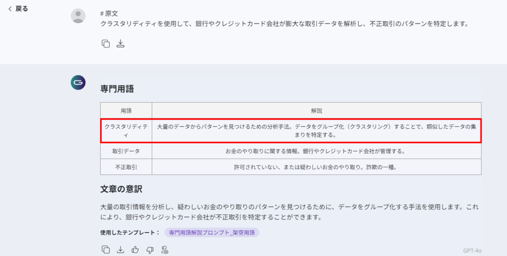 すると、このように「専門用語の解説」をテーブル形式で出力してくれます。「専門用語の解説」に加えて、「文章の意訳」も出力してくれます。