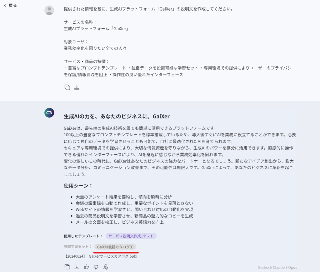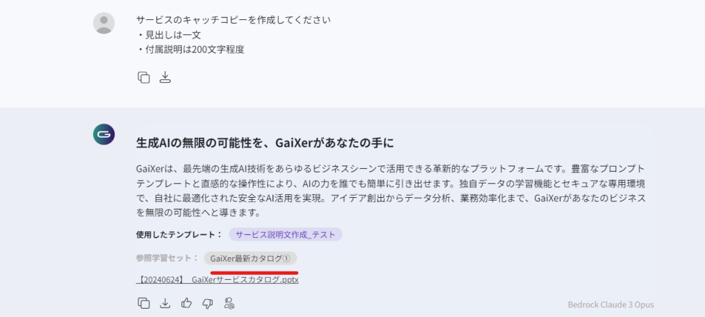 よって学習セットである「GaiXerカタログ」の情報を反映したキャッチコピーを作成することもできます。