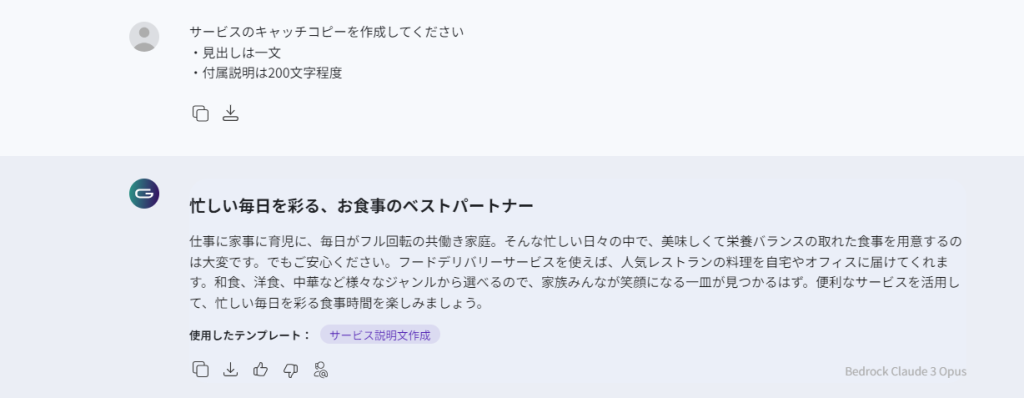 先ほどと同じように、今度は学習セットの情報を参照したキャッチコピーを作成することができます。