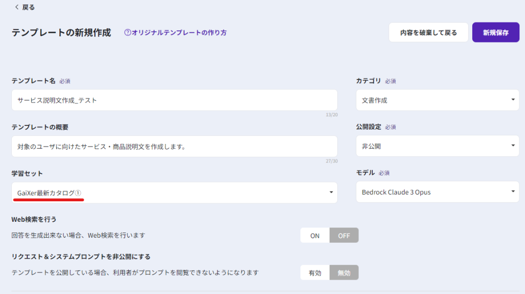 応用編として、テンプレートを複製し、事前情報がある場合、それらの資料などを学習セットへ設定することで回答の精度を向上させることができます。