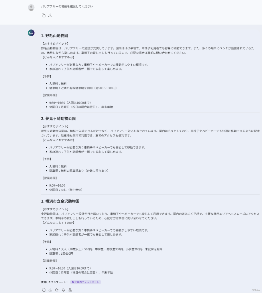 今度は、【バリアフリーの場所を選出してください】と試しに入力してみました。すると、それに対する具体的な回答を生成してくれました。
