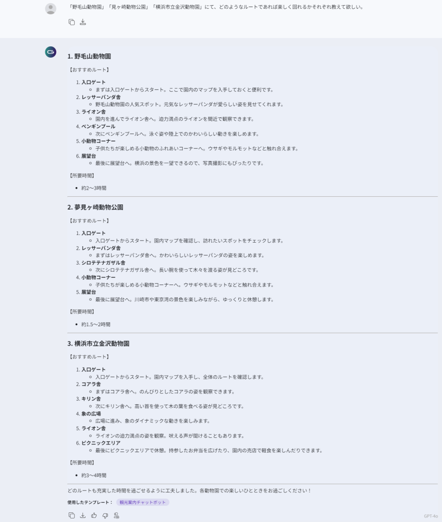 入力した内容に対して、おすすめの場所を出力してくれたので、その後「どのようなルートで回れば良いか」という質問を入力しました。すると、おすすめのルートとして「ルート順」と「所要時間」を教えてくれました。