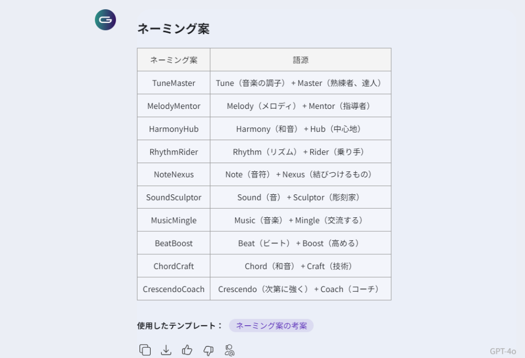 先ほど出力されたネーミング案以外のものを再度考えたい場合、同じリクエスト画面にてそのまま新たな案を考えてほしい旨を入力することで、同じフォーマットで再提案してくれます。