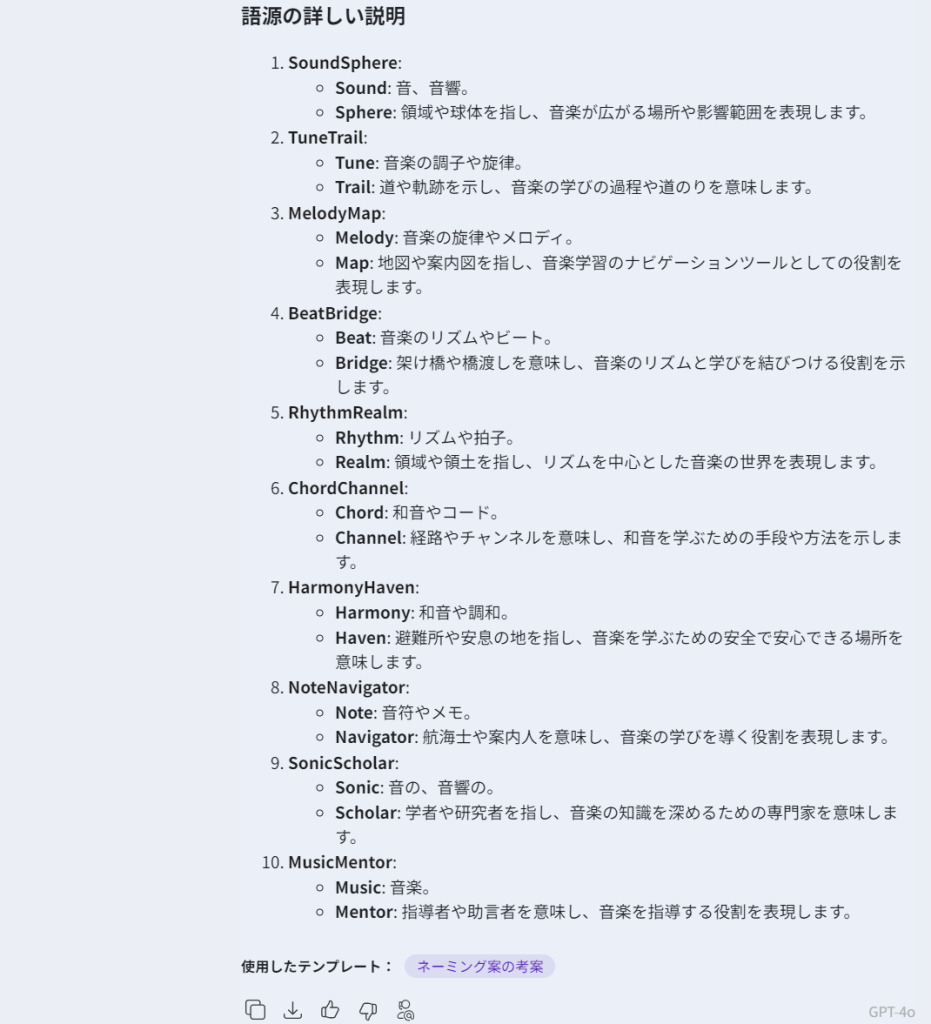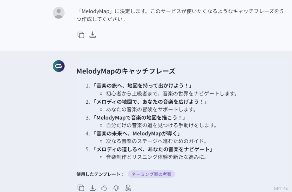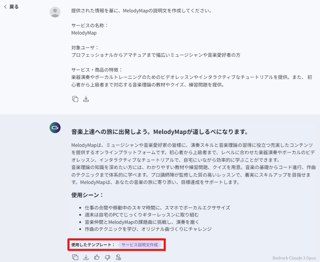 試しに、先ほど「ネーミング案の考案」テンプレートで提案された「MelodyMap」をサービスの名称として使用し、その他の情報も入力して、説明文を作成させました。