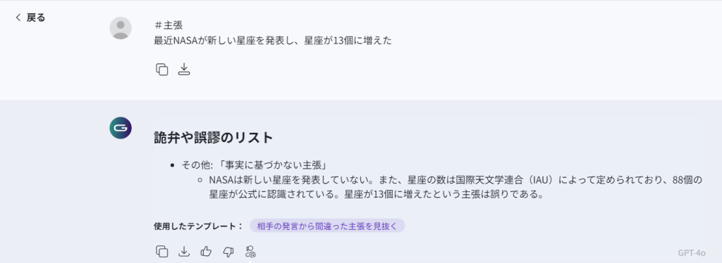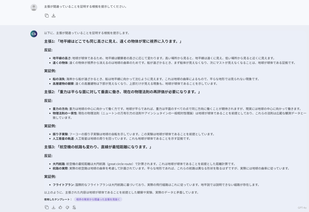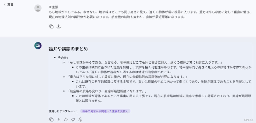 ただし、「主張」に記載されている文章のように主張が間違っているかの判断が難しく事実関係が不明な場合は、理論の飛躍や不確実性を含む部分の指摘、または解説を行ってくれます。