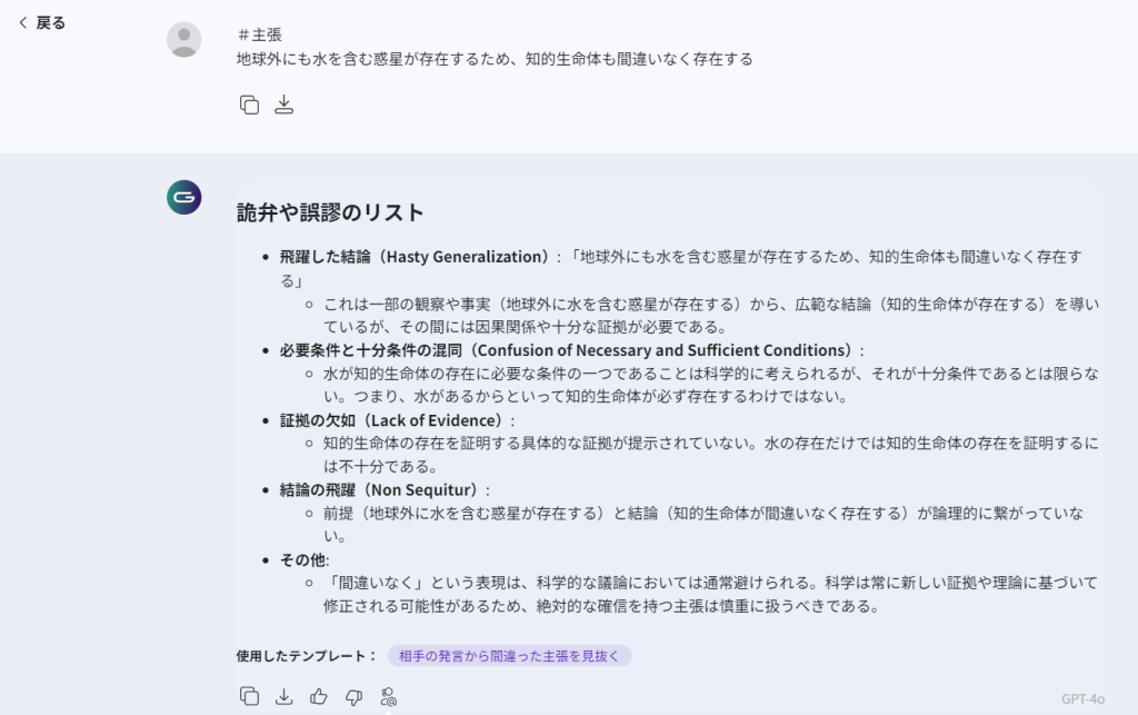 今回は、「相手の発言から間違った主張を見抜く」テンプレートのデモンストレーションを紹介します。