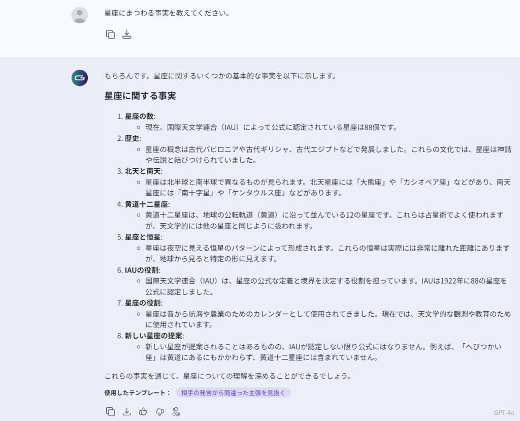 こちらも事実に基づかない情報を指摘し、正しい情報を提供してくれました。その後に正しい事実に関する詳細や、詳しい解説も出力することができます。