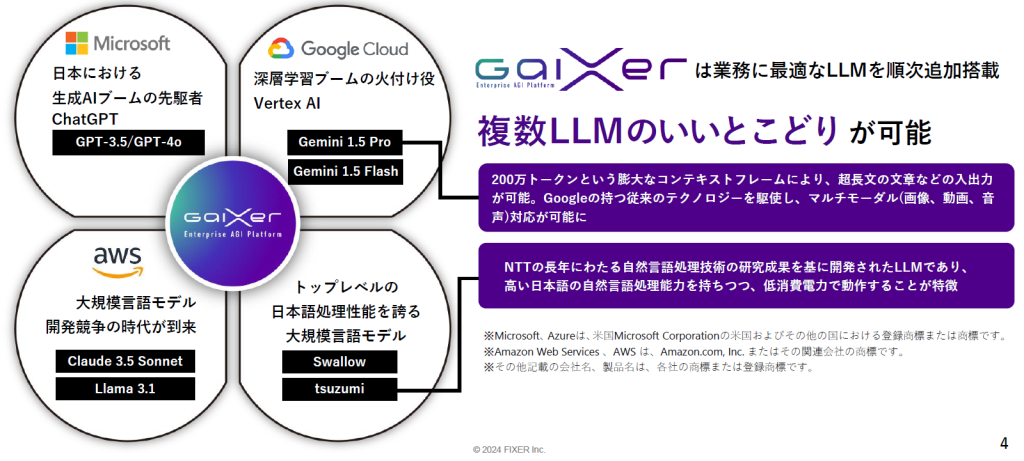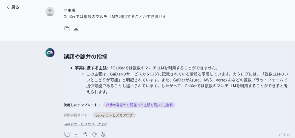 このように、「マルチLLM機能」に関する誤った情報を入力しましたが、学習セットされたGaiXerサービスカタログの情報を元に正しい情報を回答してくれました。
