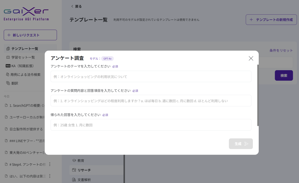 まずは使用するテンプレートを押下し、以下の項目を入力して生成をします。