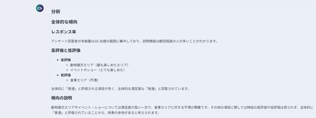 最初に、「全体的な傾向」の欄には「レスポンス率」や「評価別の傾向」が表示され、それに基づいた「傾向の説明」も出力されます。