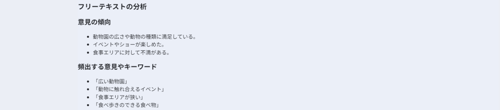 実施したアンケートに自由記述欄や備考欄がある場合、そちらに回答があれば「フリーテキストの分析」で、その内容も分析してくれます。