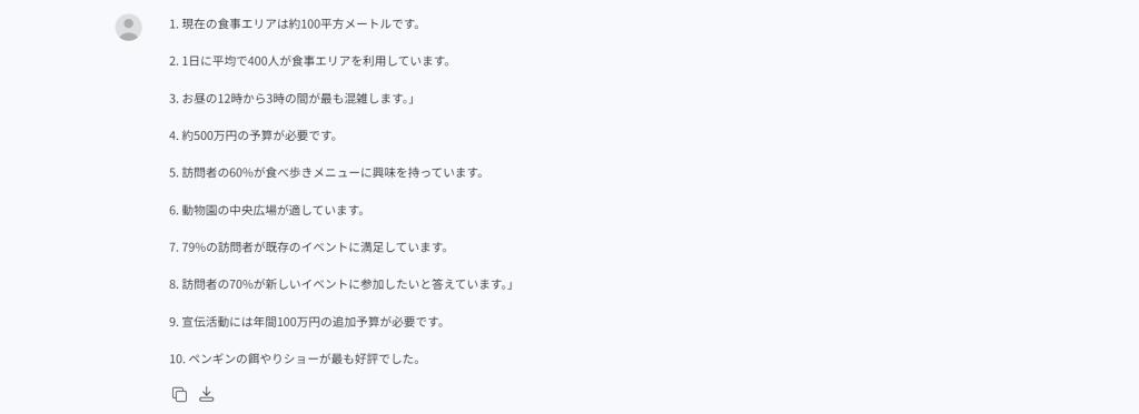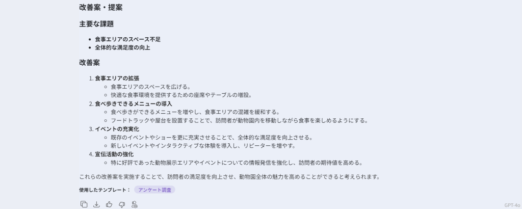 最後に、アンケート結果を受けての「改善案」と「提案」が出力されます。