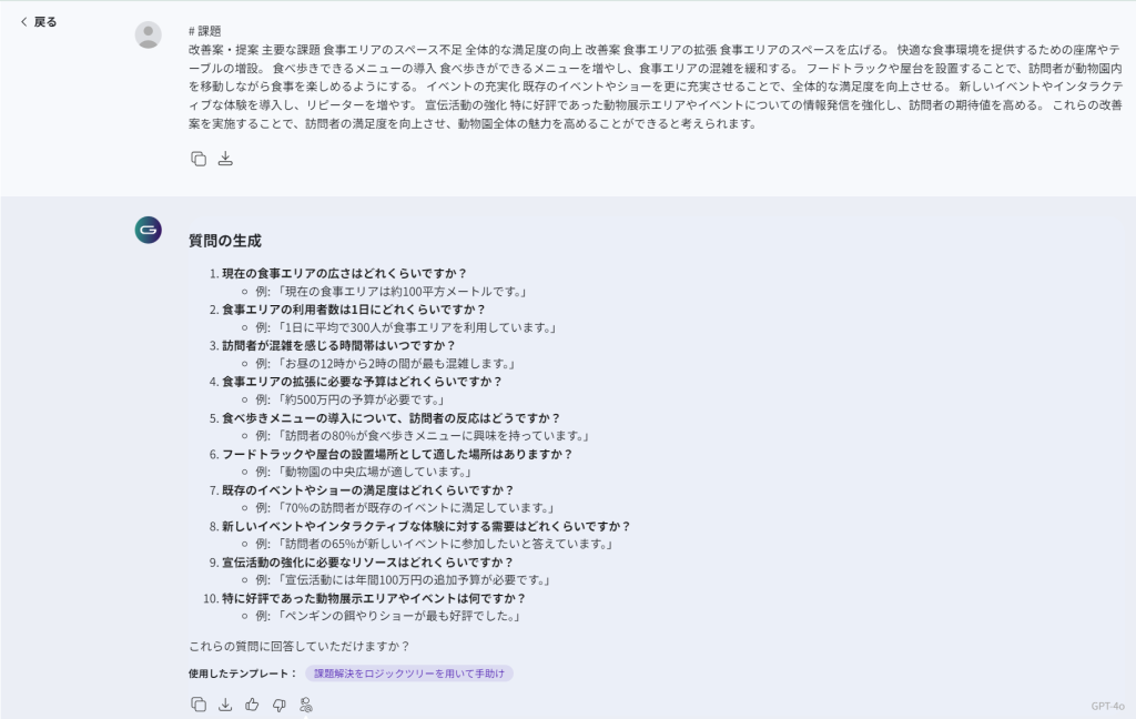 まず、「課題解決をロジックツリーを使って手助け」テンプレートに「改善案」と「提案」を入力します。その後、生成された質問に対して返答します。
