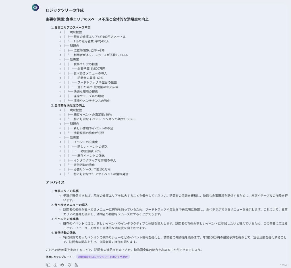 応用として、今回ご紹介したテンプレートで生成された「改善案」と「提案」を、「課題解決をロジックツリーを使って手助け」テンプレートを使用し、さらに具体的な解決策を生成させます。