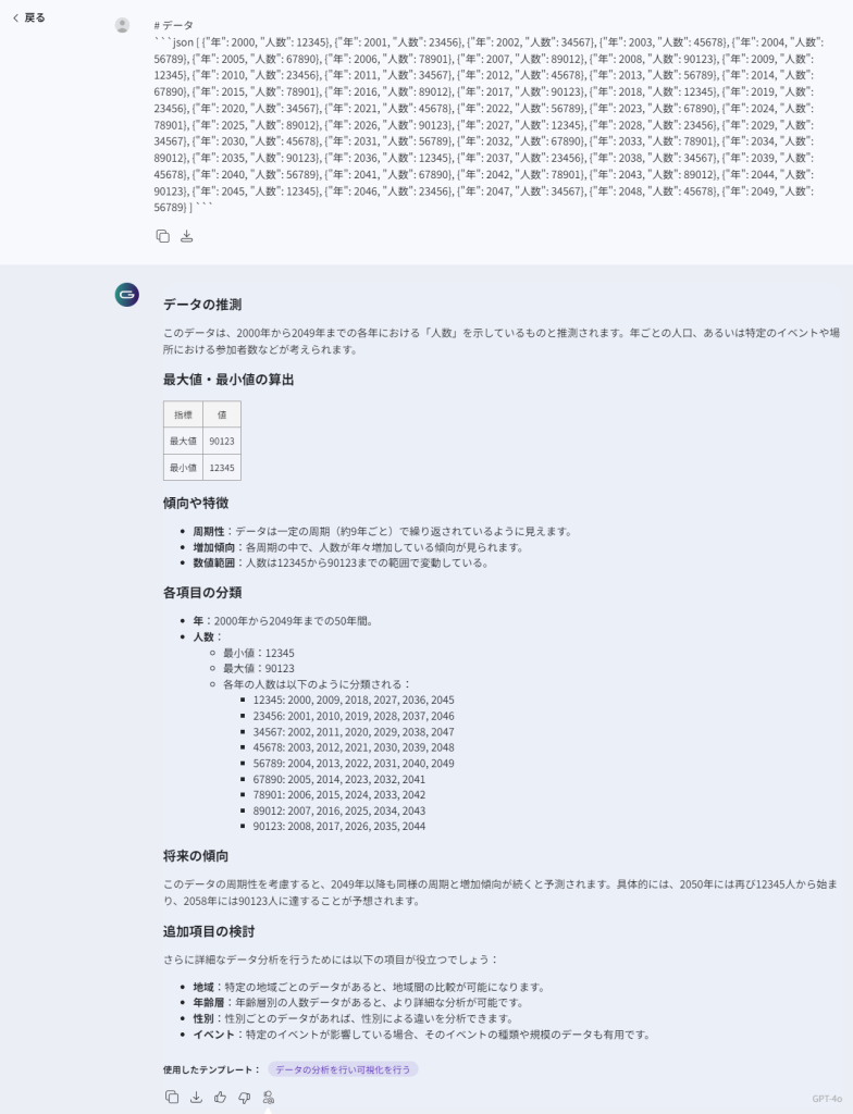 応用として、出力されたデータを可視化したい場合は、「データの分析を行い可視化を行う」というテンプレートを利用することで可視化を行うことができます。