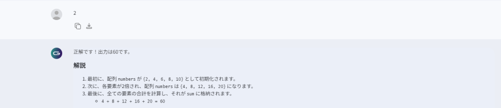 回答を行うと、解答と解説が出力されます。