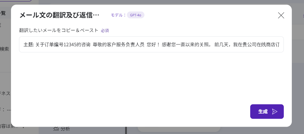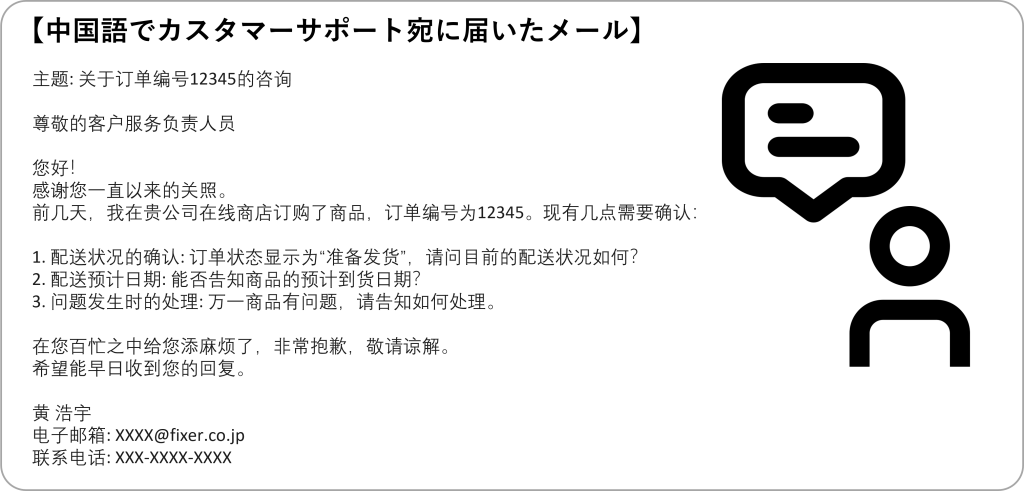 試しに、このような外国語でカスタマーサポート宛に送られたメール文をテンプレートに入力します。