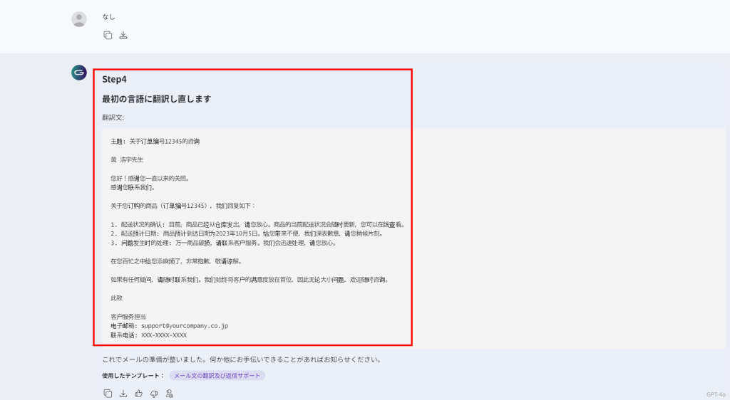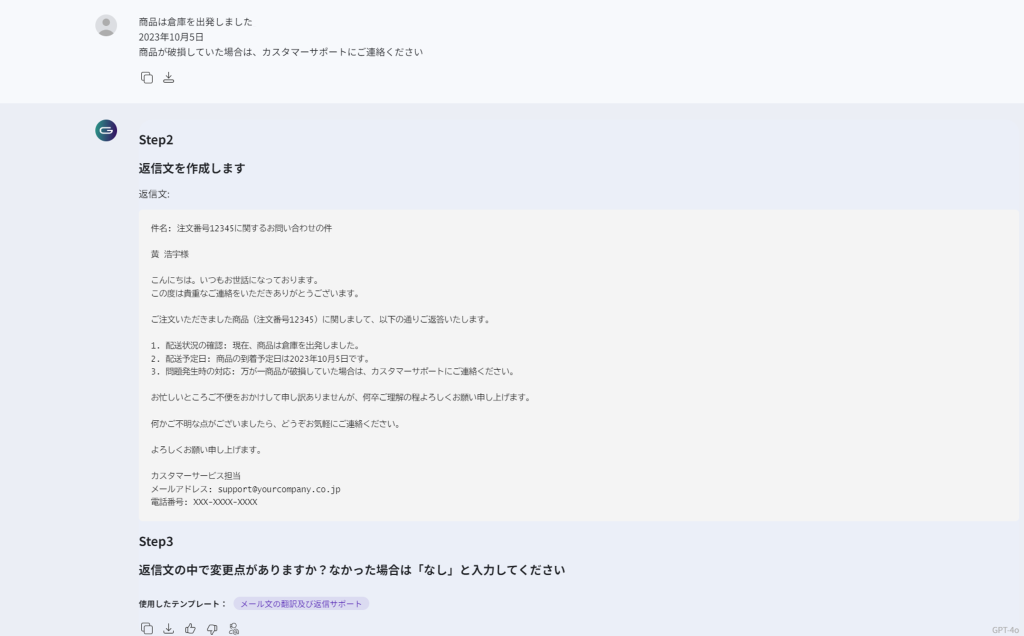 「メール文の翻訳及び返信サポート」テンプレートでは、外国語のメールを日本語に翻訳し、返信までの一連の作業をサポートしてくれます。