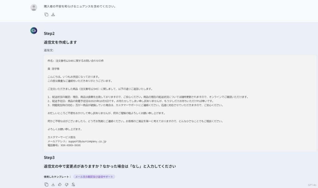 「メール文の翻訳及び返信サポート」のテンプレートでは、ユーザーが外国語で受け取ったメールを日本語に翻訳し、その後、適切な返信を作成するプロセスをサポートします。特に、ビジネスシーンや国際的なコミュニケーションが必要な場面で役立ちます。