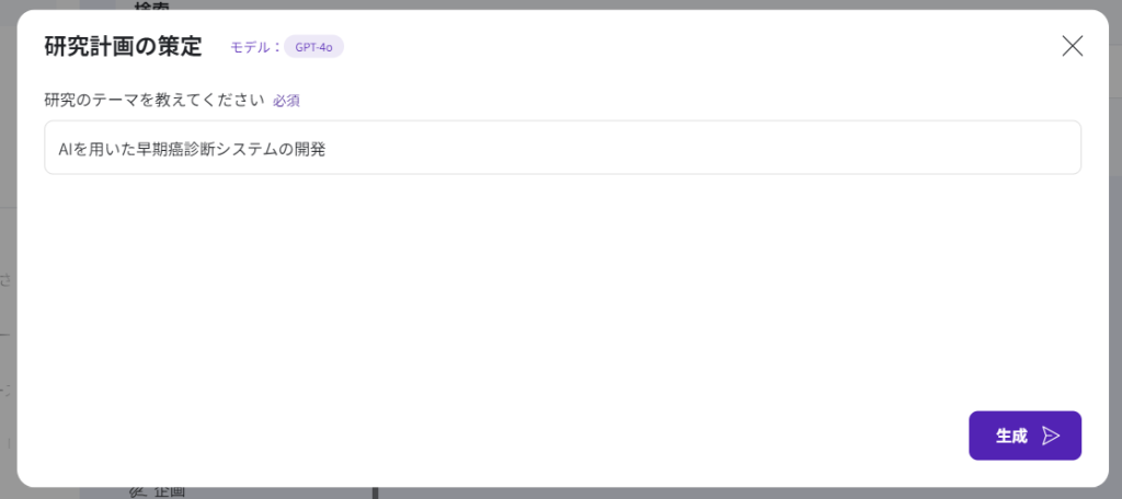 「研究計画の策定」テンプレートでは、テンプレート内にある項目へテーマを入力するだけで研究計画の策定を行ってくれます。