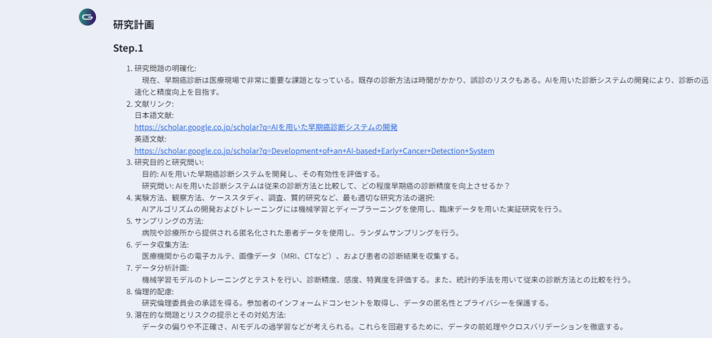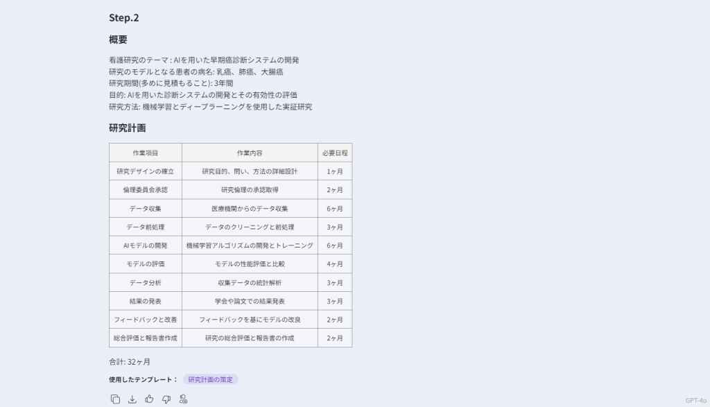 最後はstep.2にて、研究の「概要」と最終的な「研究計画」をテーブル形式で出力してくれます。