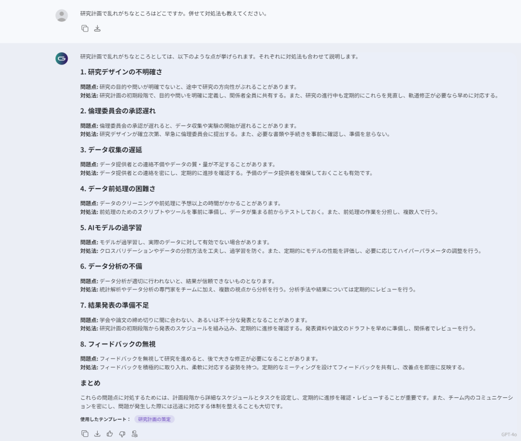 すると、研究計画で乱れがちなところと対処法を出力してくれます。