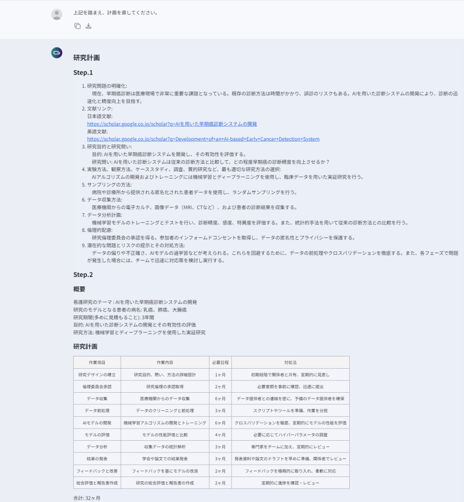 最後に出力結果を研究計画へ反映するように指示してみました。