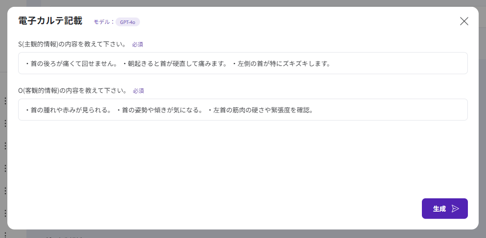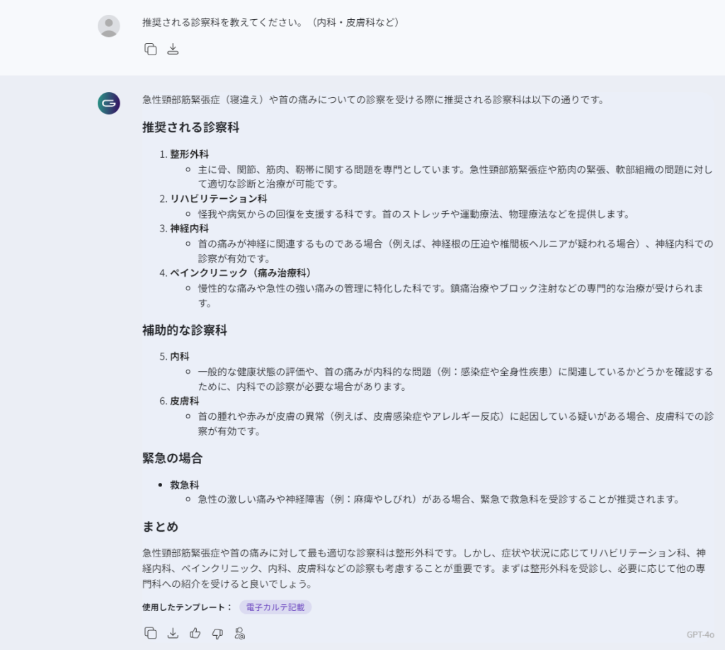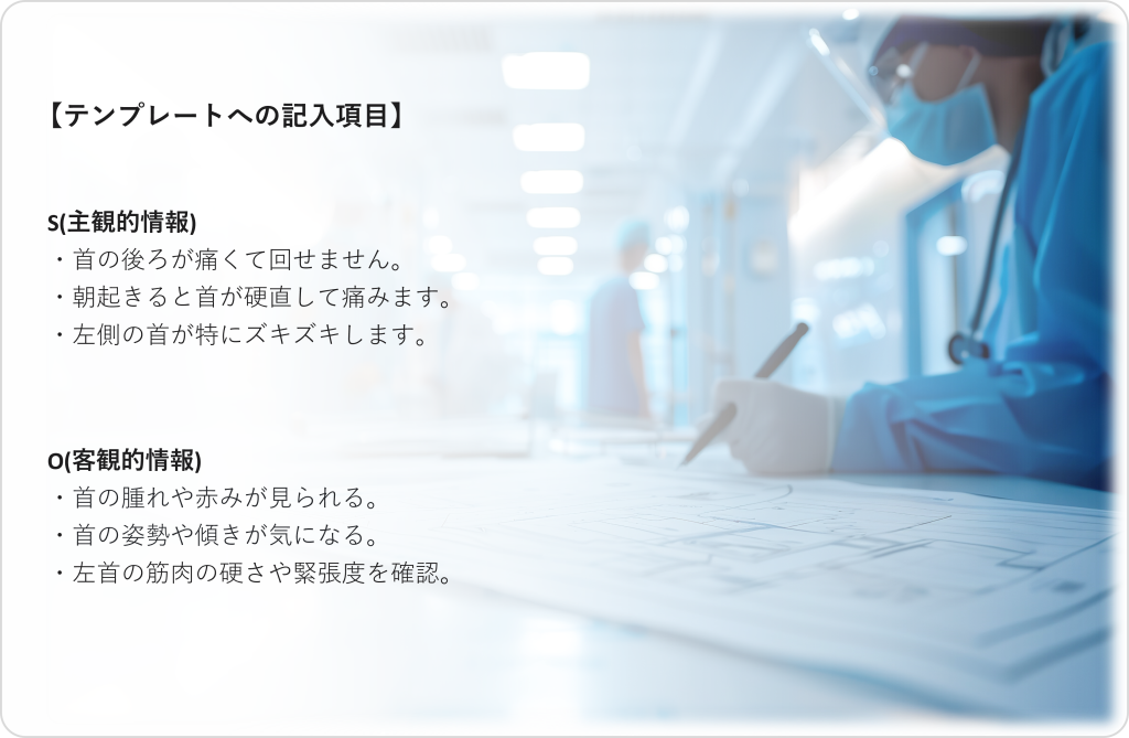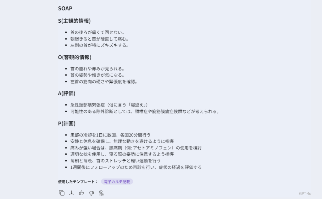 「電子カルテ記載」テンプレートでは、医師や看護師が患者の診察結果を詳細に記録する手助けを行ってくれます。