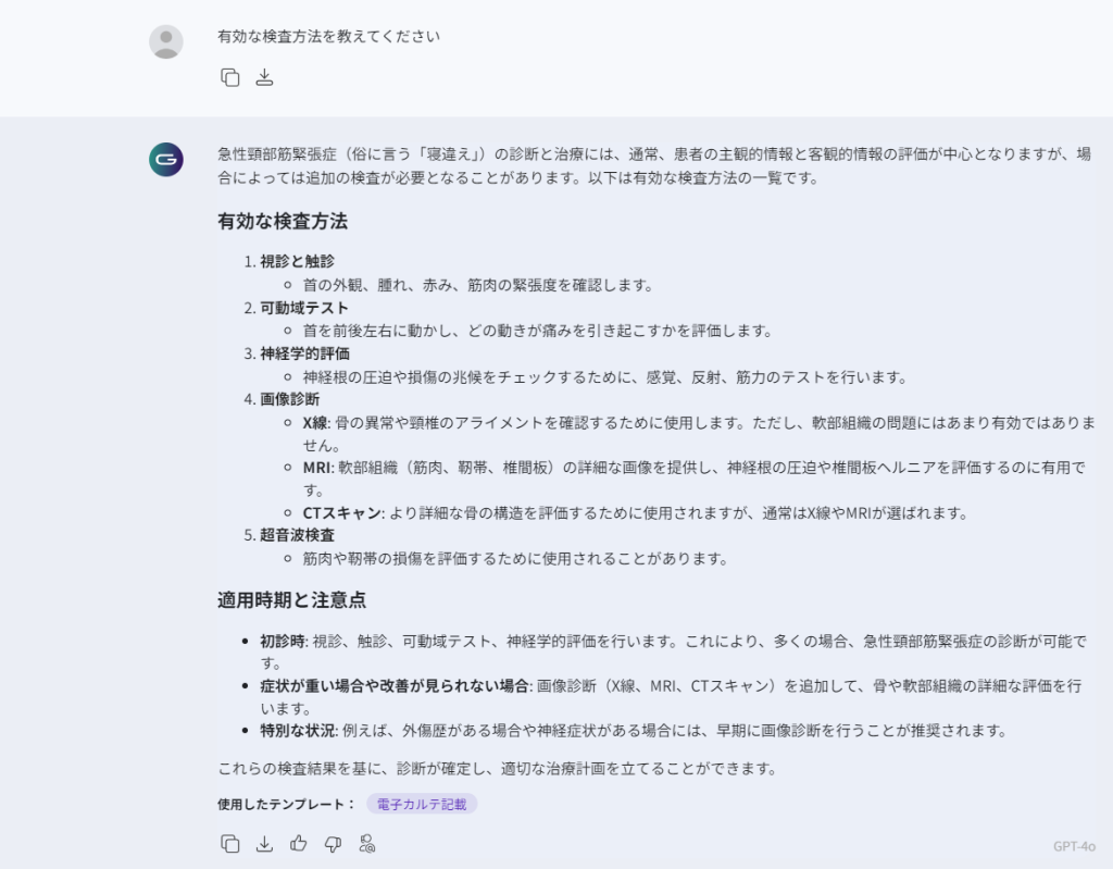 SOAPを踏まえ症状に対する有効な検査方法などを、同じ生成画面で出力させることができます。
