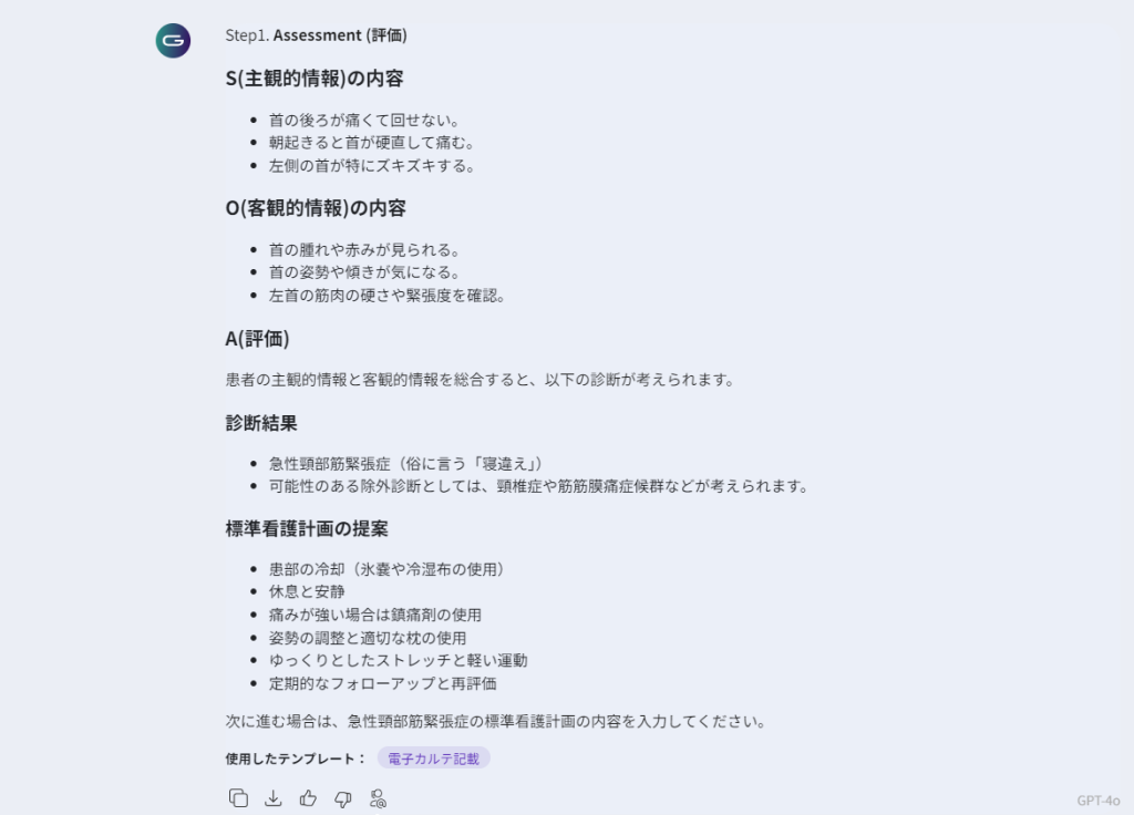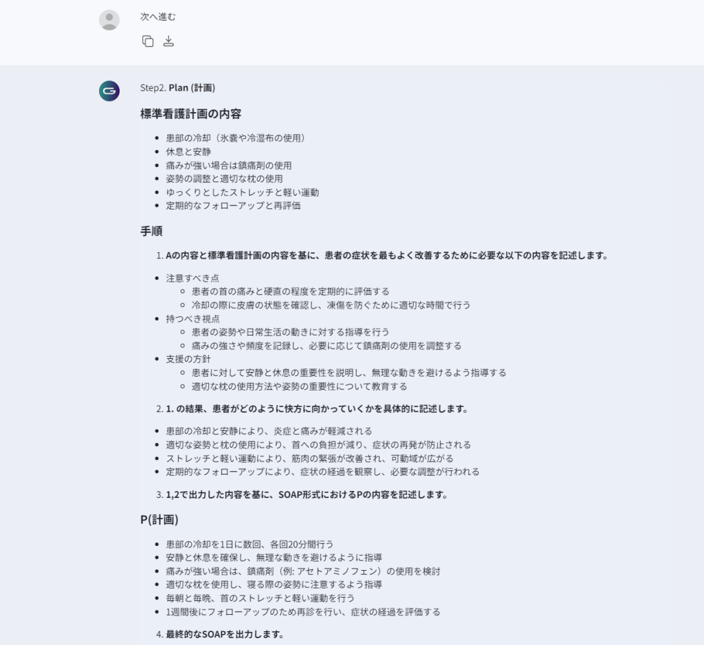 最初は「Step1」にて「Assesment(評価)」「診断結果」と「標準的な看護計画」の提案を出力します。