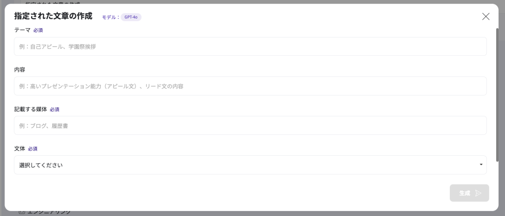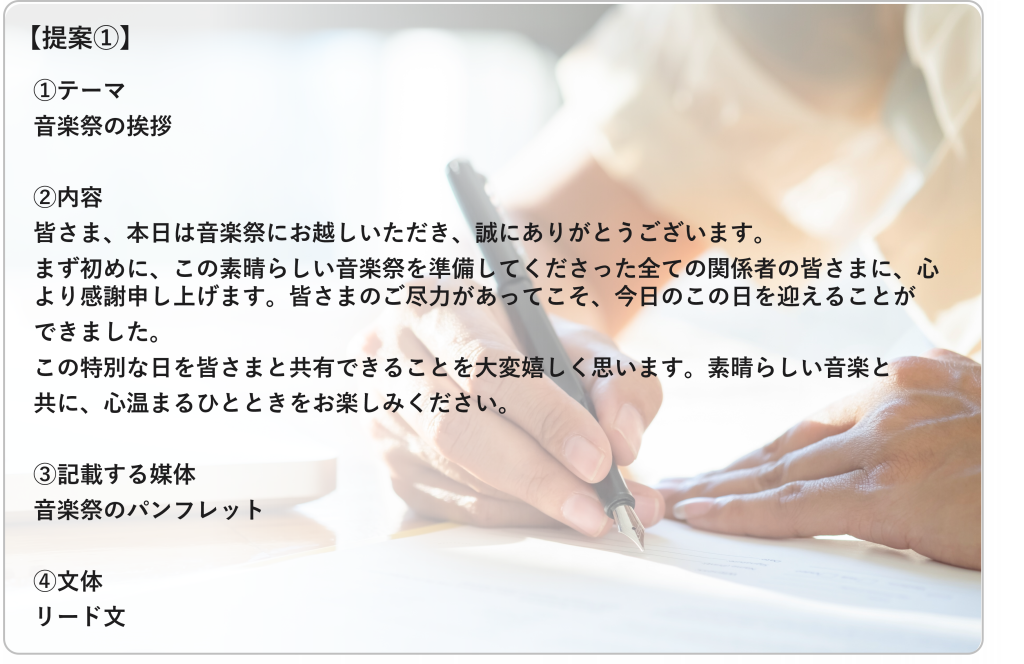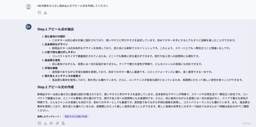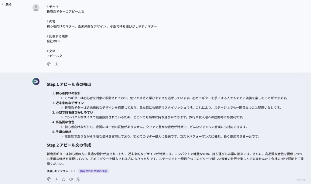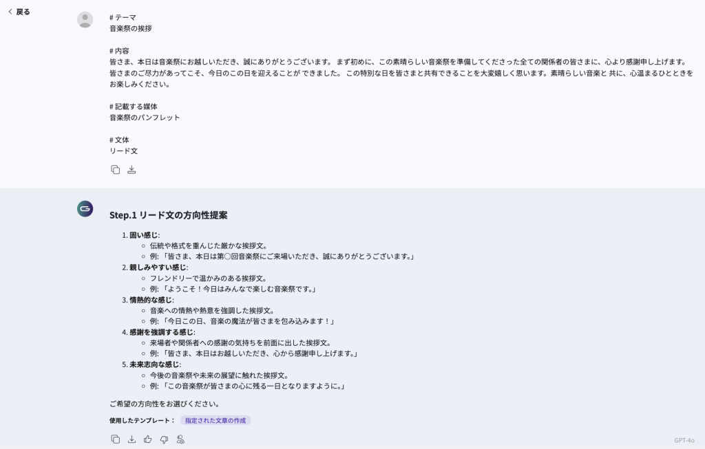 「指定された文章の作成」テンプレートでは、指定したテーマや内容に沿った形で「リード文」もしくは「アピール文」を提案してくれます。