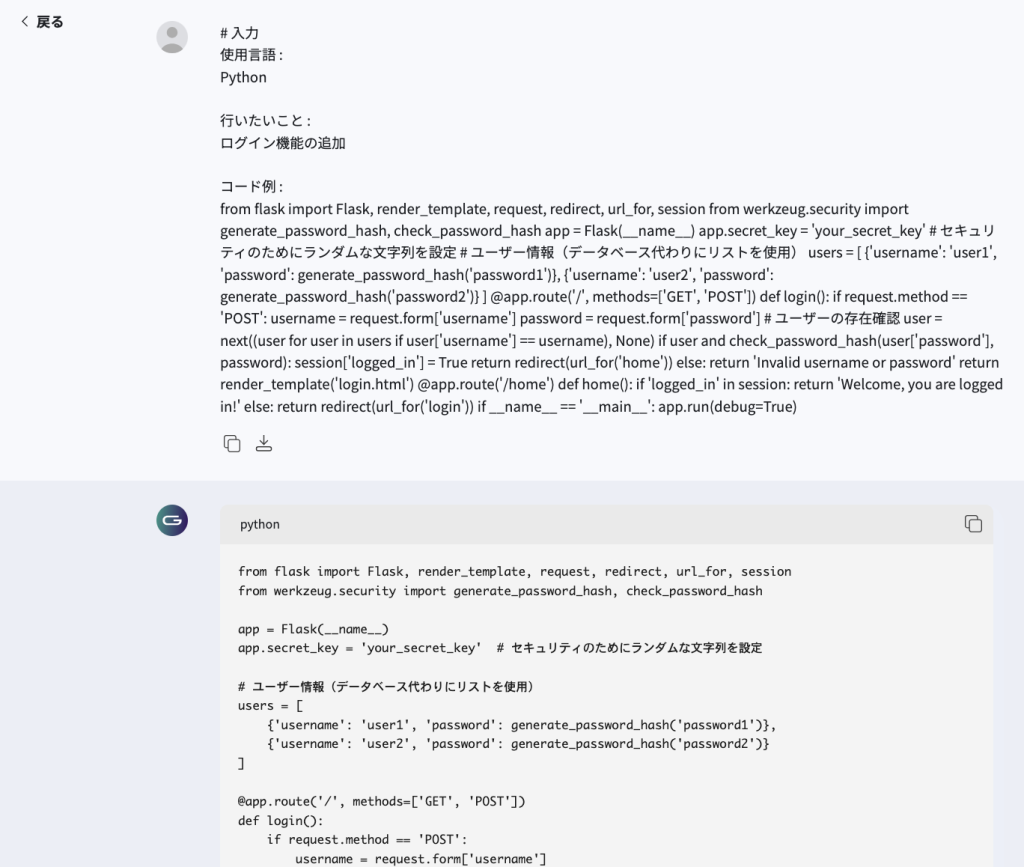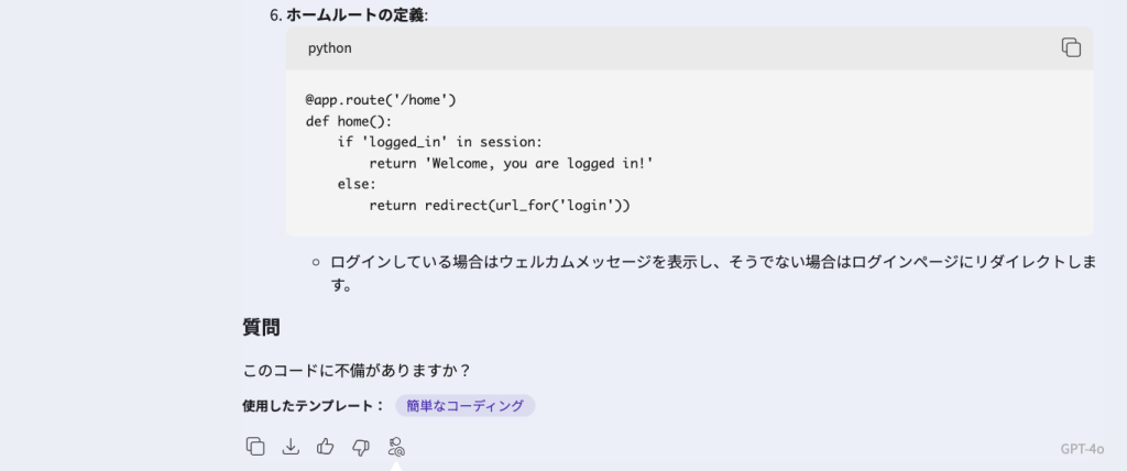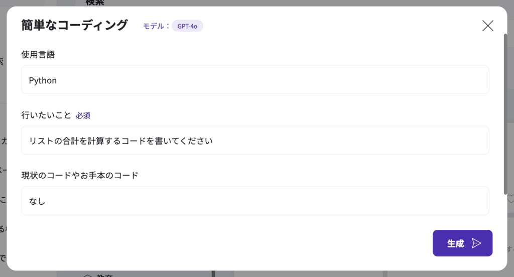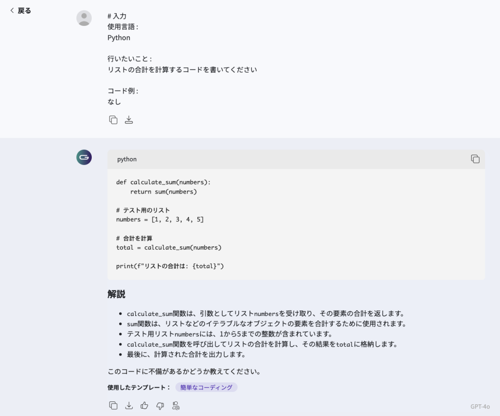 「簡単なコーディング」を行うテンプレートでは、コーディングに関する具体的な要求を入力することで、指定されたプログラミング言語で適切なコードを生成してくれます。