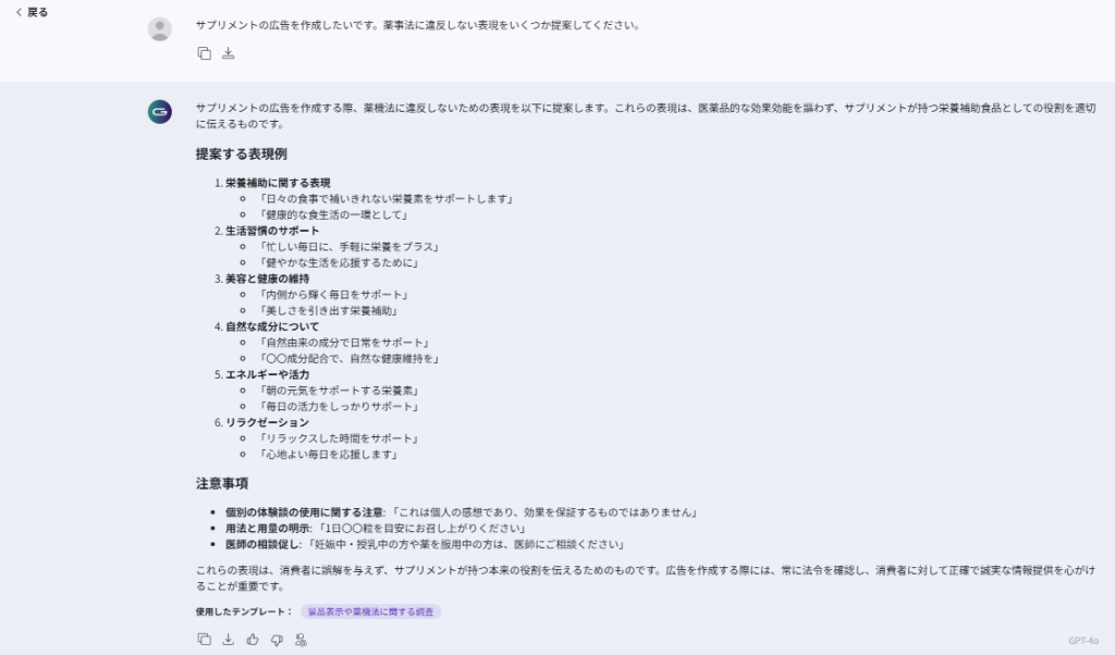 これにより、「提案する表現例」とサプリメントの広告を作成するにあたっての「注意事項」を出力してくれました。