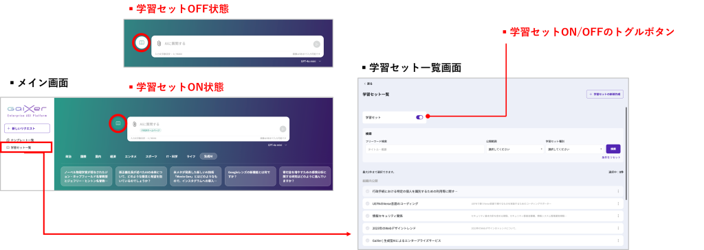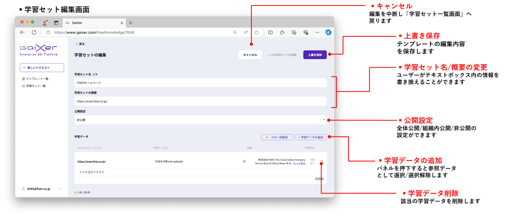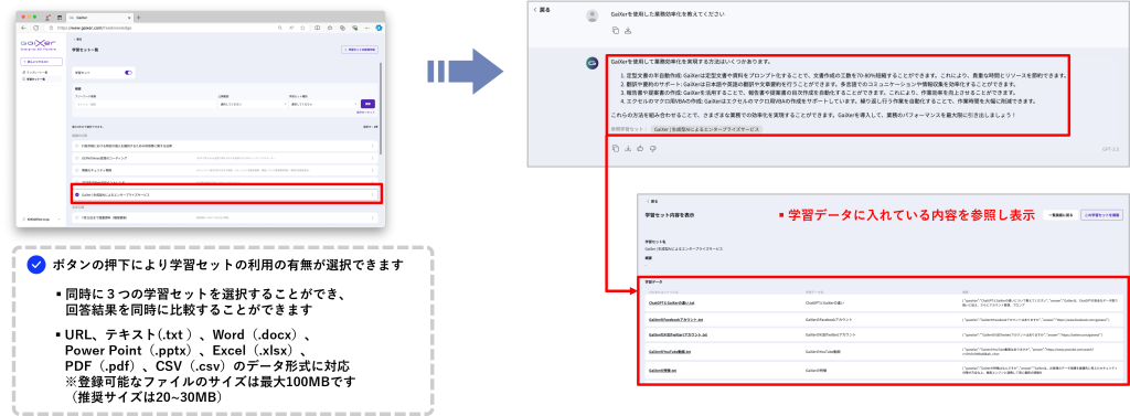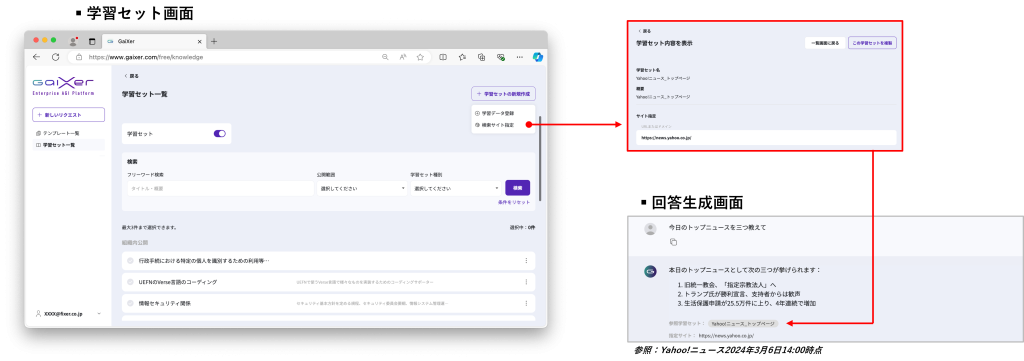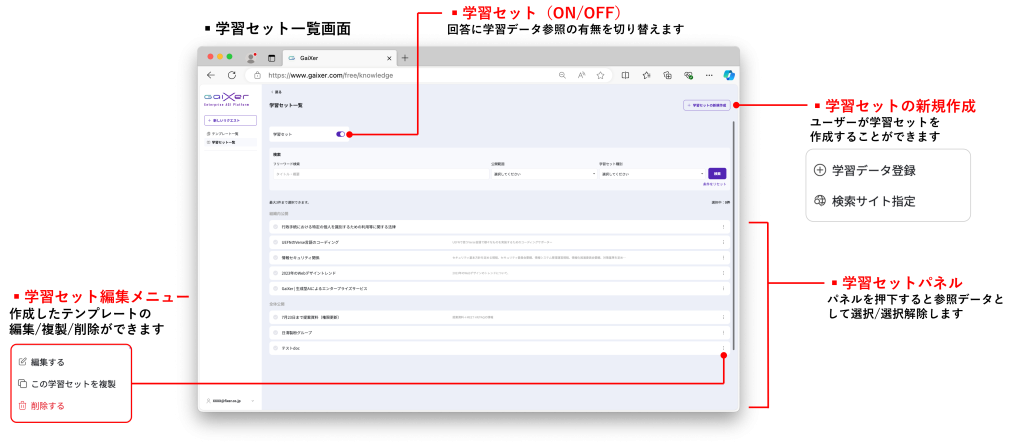 GaiXerには「学習セット」と呼ばれる機能があり、特定の情報源を設定することで曖昧さを避け、ユーザーが求める的確な回答を得ることができます。この機能は、独自のサイトや資料を元にAIに回答を生成させたい場合に役立ちます。