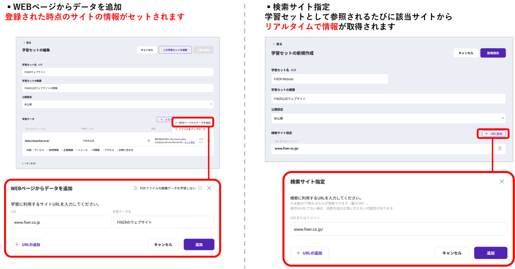 新しい学習セットを作成する際に、「検索サイト指定」オプションを選択することにより、URLに記載された最新情報に基づいた回答生成を行うことができます。