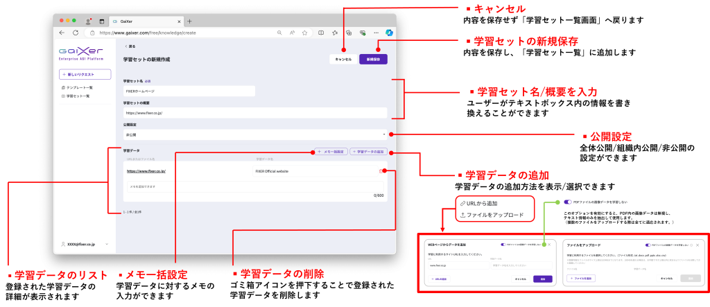 GaiXerには「学習セット」と呼ばれる機能があり、特定の情報源を設定することで曖昧さを避け、ユーザーが求める的確な回答を得ることができます。この機能は、独自のサイトや資料を元にAIに回答を生成させたい場合に役立ちます。