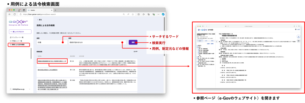 用例による法令検索 「用例による法令検索」は、日本の憲法、法律、政令、府省令、規則などの法令情報を検索し、確認できます。この機能を利用することで、最新の法令内容を確認したり、特定の法律に関する詳細情報を参照することができます。