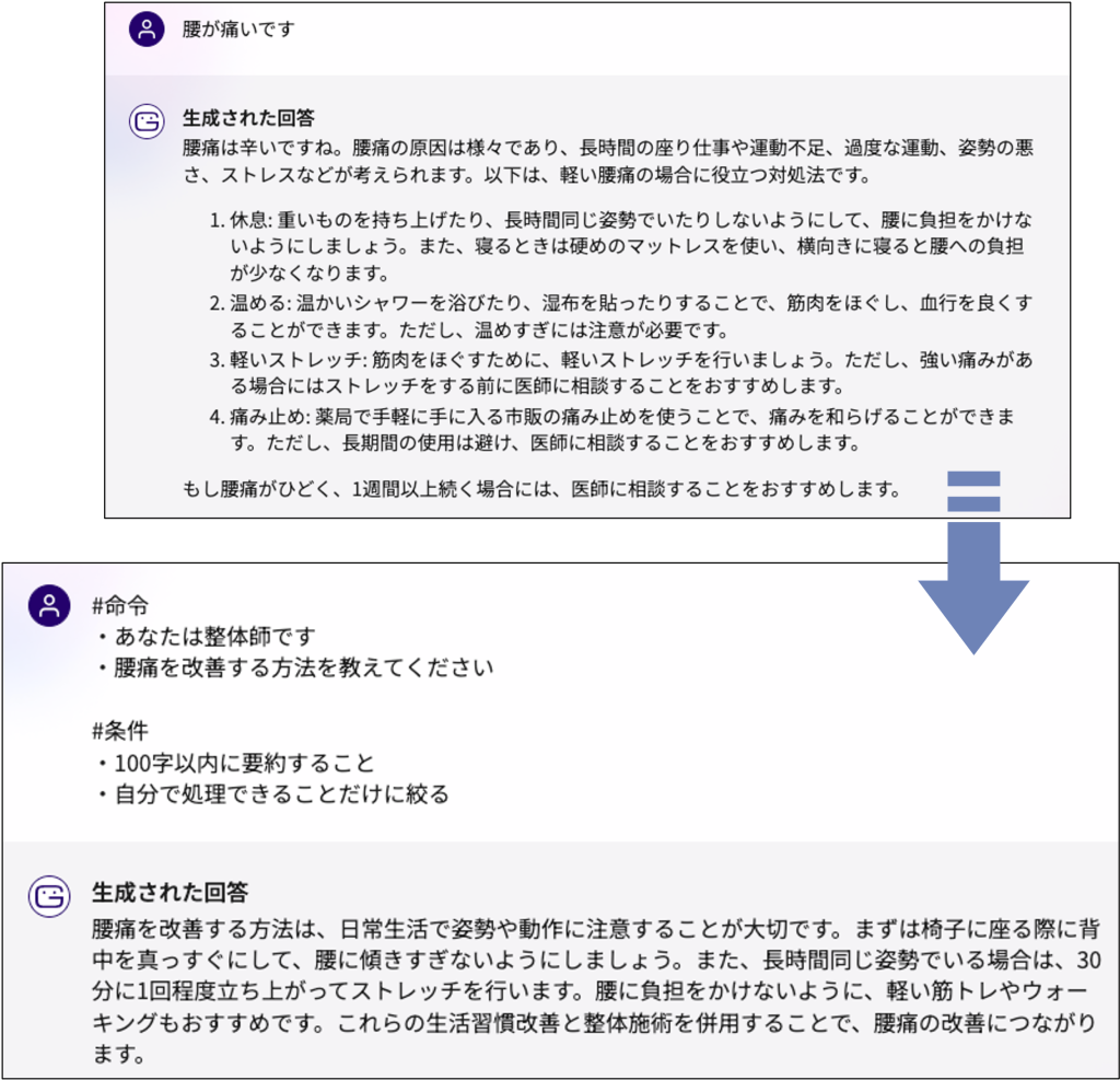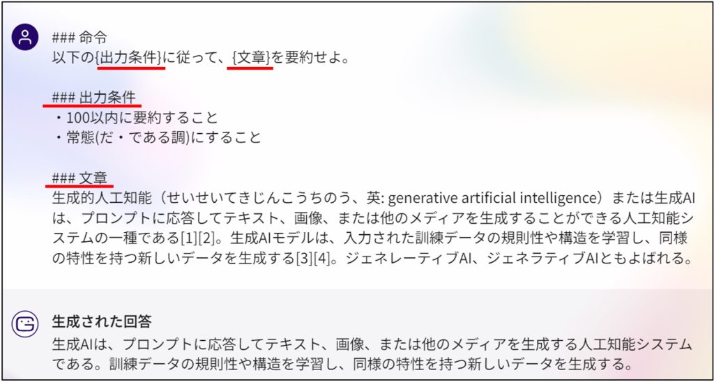6.プロンプトを理解する&効果的なプロンプトを設定する ① プロンプトとは、ユーザーが入力するテキストや質問を指します。 ② 具体的で明確なプロンプトを以下のような{ブロック名}と#などの記号を用いて記載することにより識別されやすくなります。 効果的なプロンプトを設定する ▪️プロンプトを構成する要素(ブロック)を具体化することで得られる回答の精度が上がります。 ▪️役職、役割やキャラクターを設定することでも、より効果的な回答が得られます。