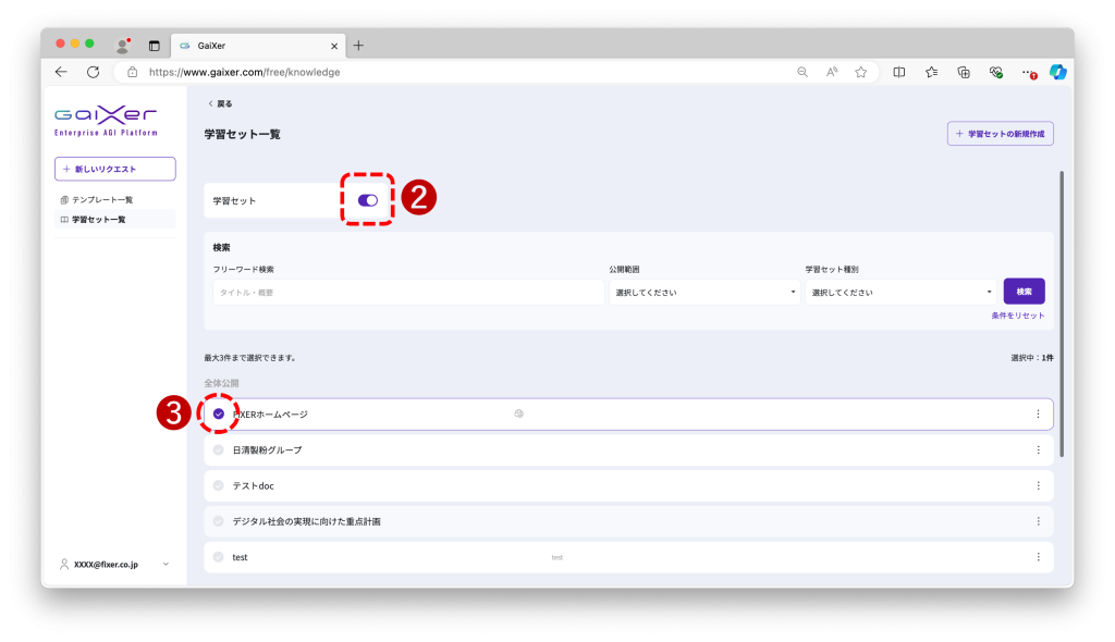 4.参照させたい学習セットを確認し、リクエストを入力します。