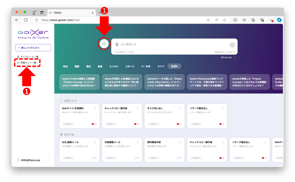 1.メイン画面左のメニューから「学習セット一覧」、もしくはテキストボックス横のブックアイコンを押下します。
