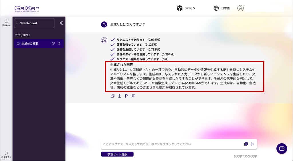 GaiXerでは、ユーザーが入力した文章やリクエスト内容に従い、文章作成、要約、翻訳、質問への回答などが行えます。