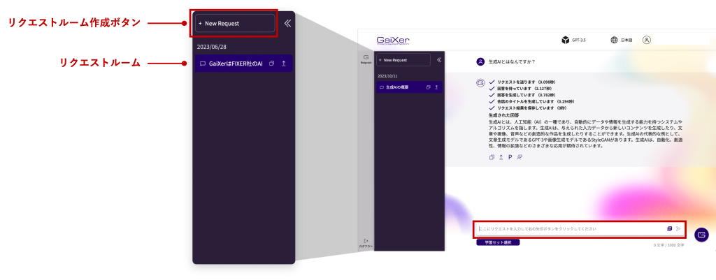 ユーザーは「プロンプト」と呼ばれるテキストやキーワードをリクエスト画面下部のテキストボックスへ入力することでGaiXerから回答を得ることができます。